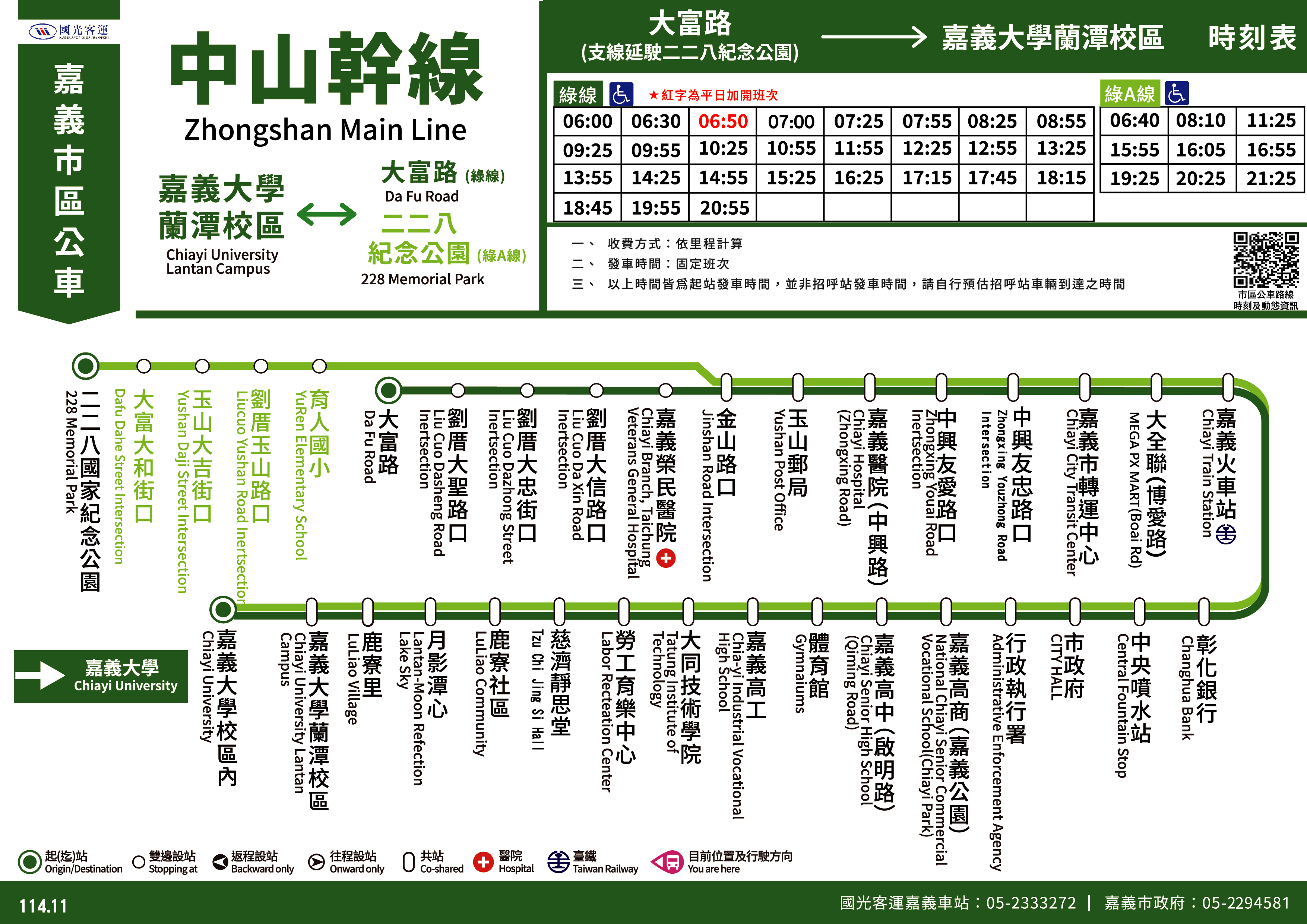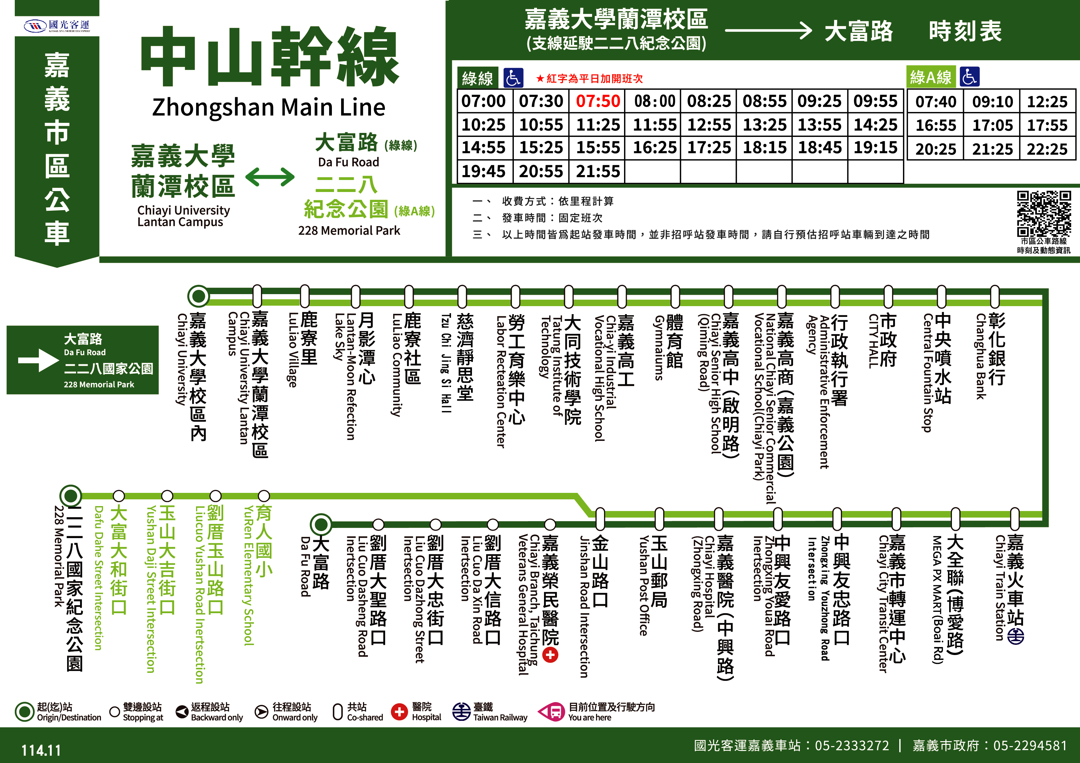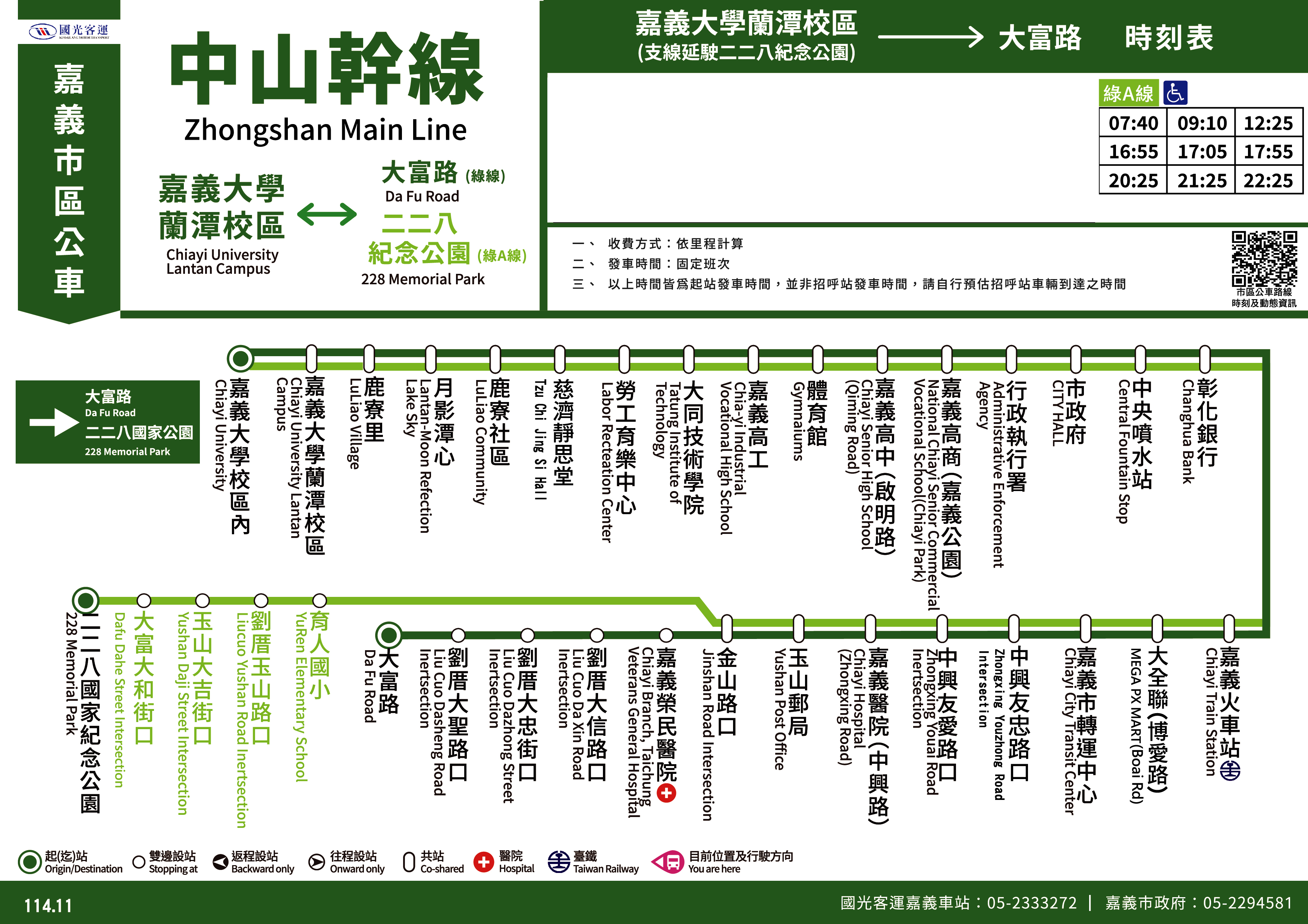停靠站:嘉義大學校區內、嘉義大學蘭潭校區、鹿寮里、月影潭心、鹿寮社區、勞工育樂中心、大同技術學院、嘉義高工、體育館、嘉義高中(啟明路)、嘉義高商(嘉義公園)、行政執行署、市政府、中央噴水站、彰化銀行、嘉義火車站、大全聯(博愛路)、嘉義市轉運中心、中興友忠路口、中興友愛路口、嘉義醫院(中興路)、玉山郵局、金山路口、育人國小、劉厝玉山路口、玉山大吉街口、大富大和街口、二二八國家紀念公園