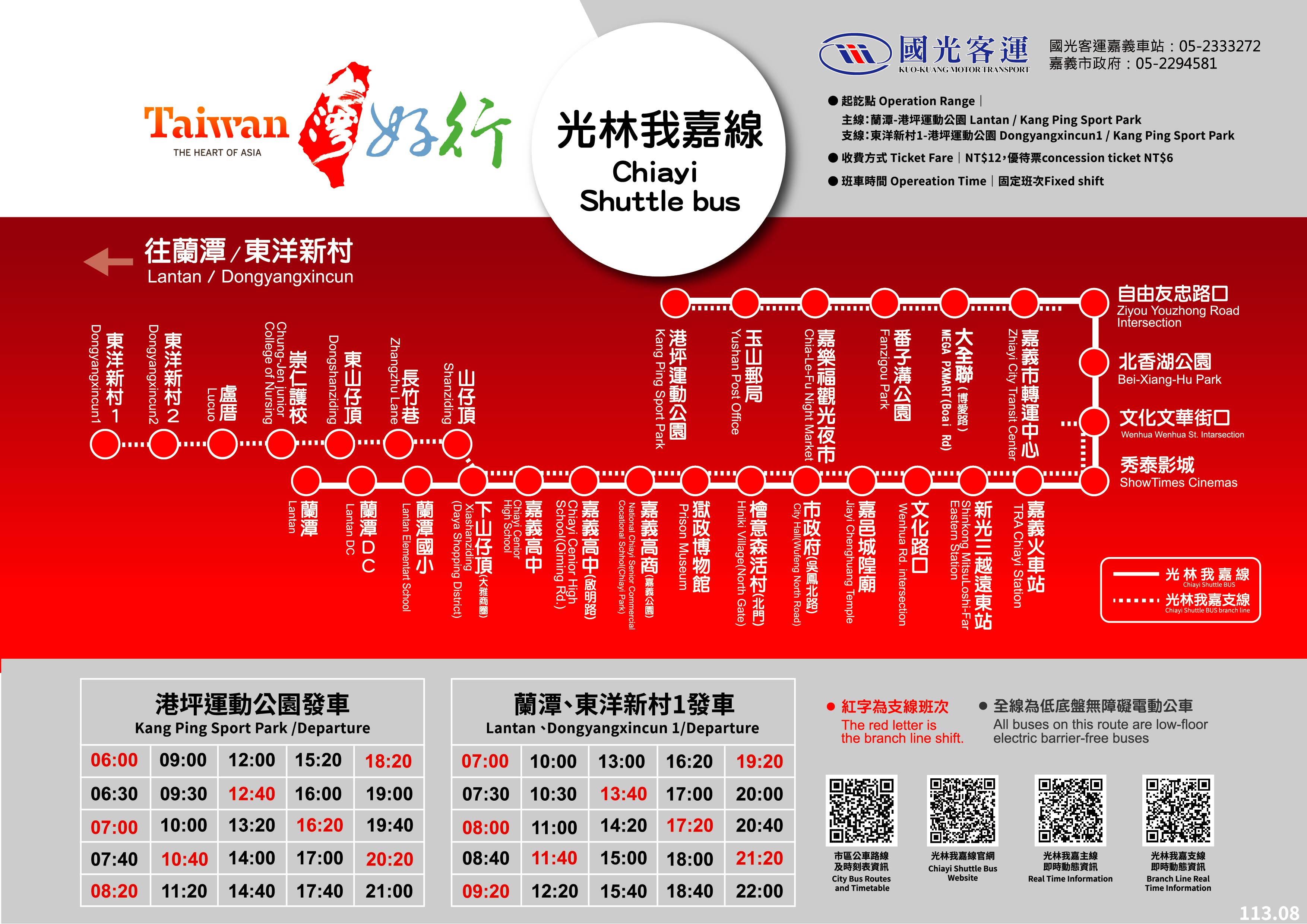 停靠站:港坪運動公園、玉山郵局、嘉樂福觀光夜市、番仔溝公園、大全聯(博愛路)、嘉義市轉運中心、自由友忠路口、北香湖公園、文化文華街口、秀泰影城、嘉義火車站、新光三越遠東站、文化路口、嘉邑城隍廟、市政府(吳鳳北路)、檜意森活村(北門)、獄政博物館、嘉義高商(嘉義公園)、嘉義高中(啟明路)、嘉義高中、下山仔頂(大雅商圈)、蘭潭國小、蘭潭DC、蘭潭