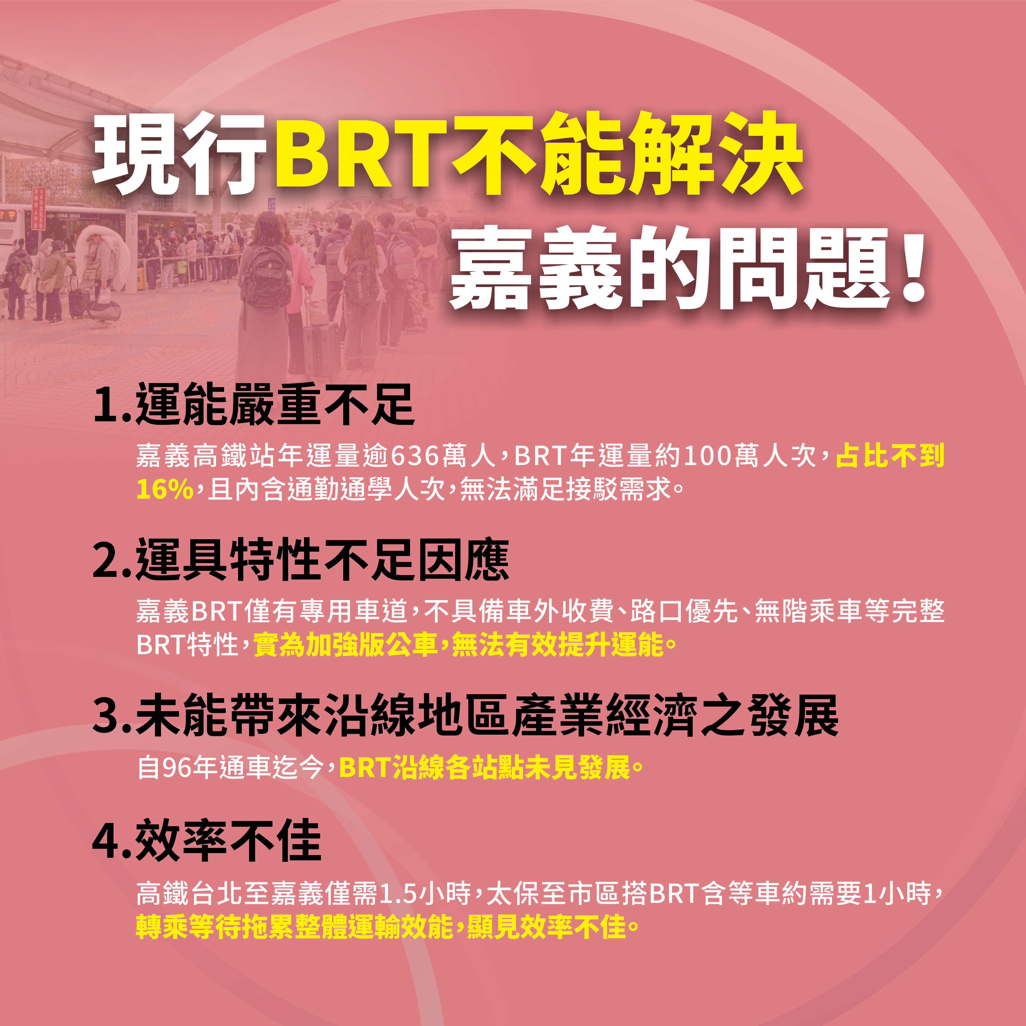 高鐵台北至嘉義僅需1.5小時,太保至市區搭BRT含等車約需要1小時,轉乘等待拖累整體運輸效能,顯見效率不佳。