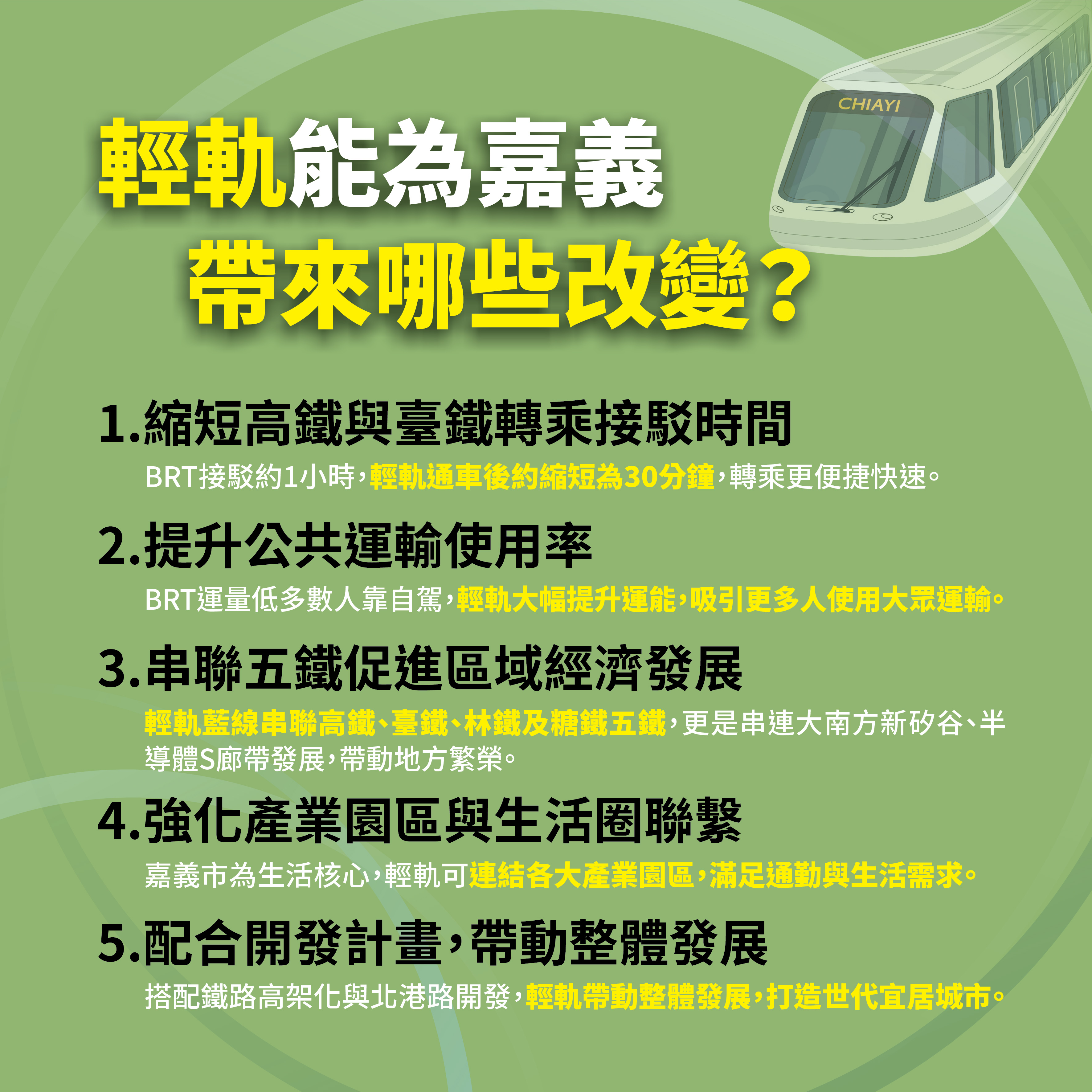 - 強化產業園區與生活圈聯繫 嘉義市為生活核心,輕軌可連結各大產業園區,滿足通勤與生活需求。