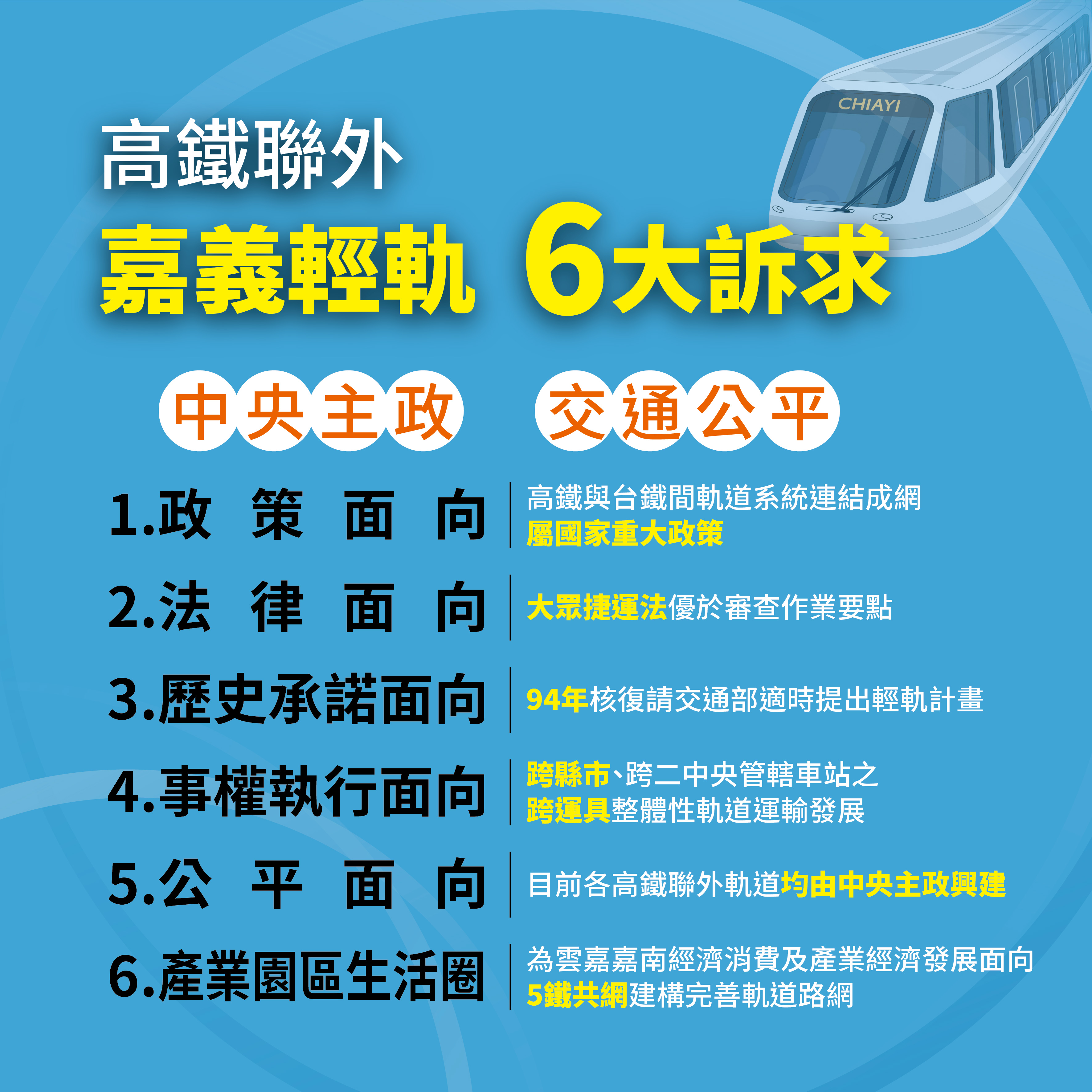 - 公平面向:目前各高鐵聯外軌道運輸均由中央主政興建,唯獨高鐵嘉義站是唯一有規劃沒興建軌道運輸的高鐵站。